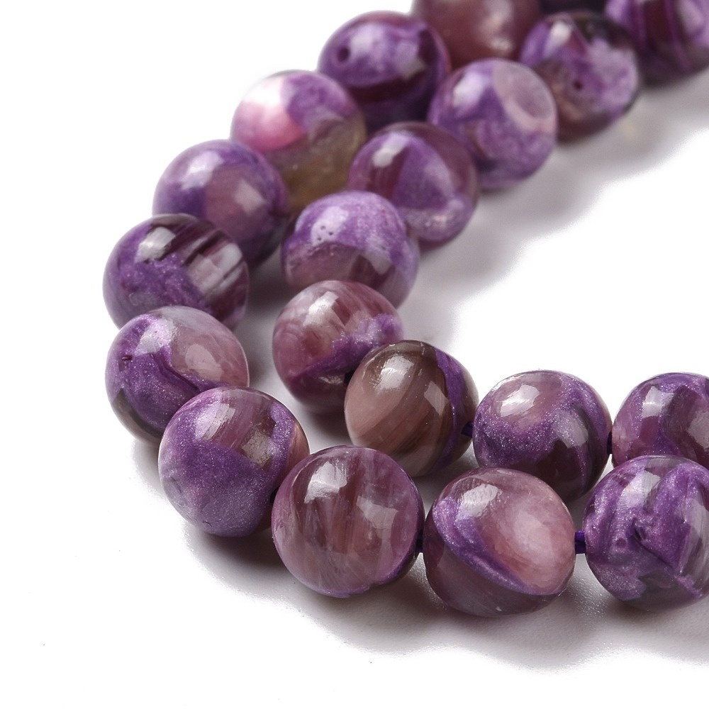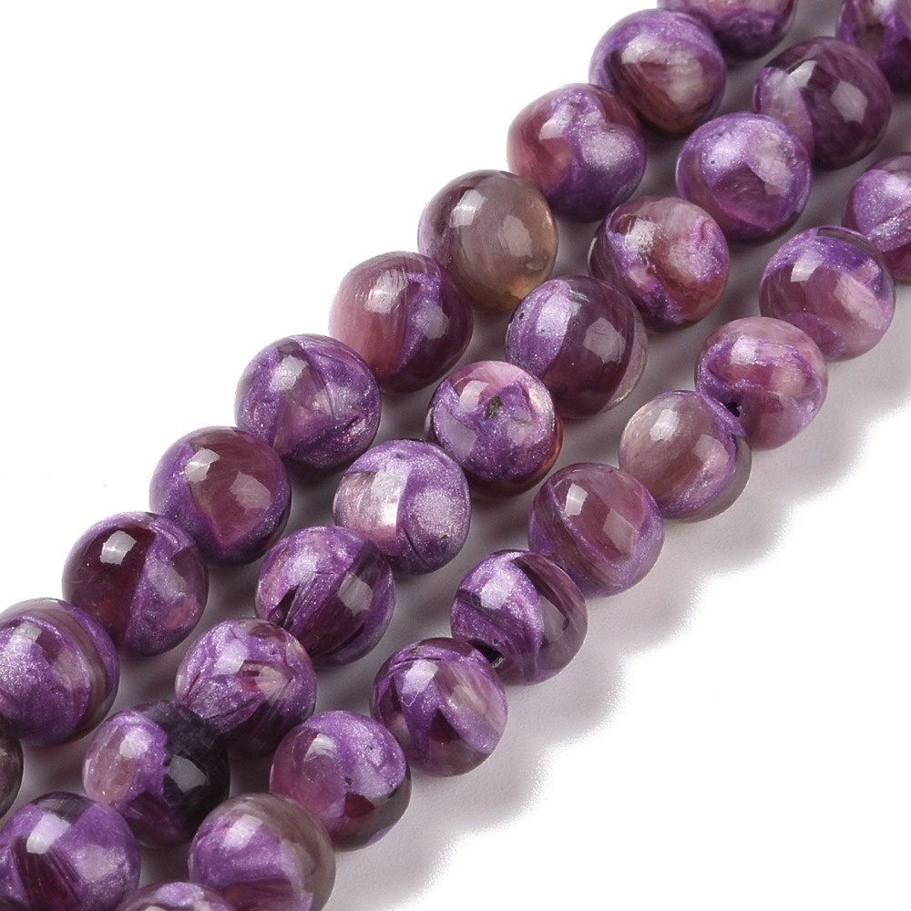 Streng van ca. 46 ronde lepidoliet kralen van 8 mm, gaatje 1 mm, lengte ca. 40 cm. Mooie paarse tinten met natuurlijke glans. Perfect voor sieraden met een rustige, elegante uitstraling. Prijs per streng.